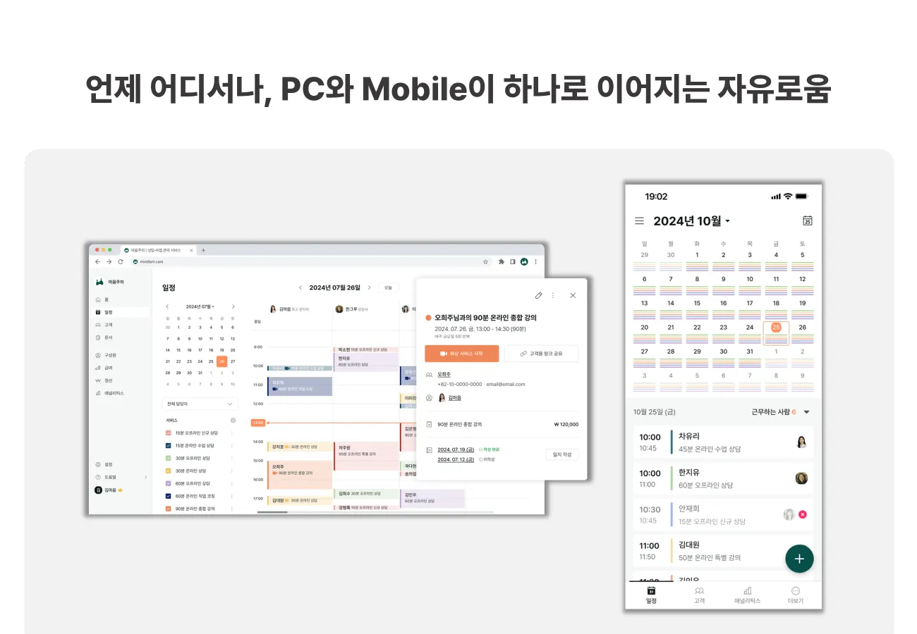 마음주의 Mobile에서도 대부분의 기능을 손쉽게 이용하실 수 있으며, 추가적인 설정과 관리 기능은 PC에서 편리하게 이용 가능합니다.