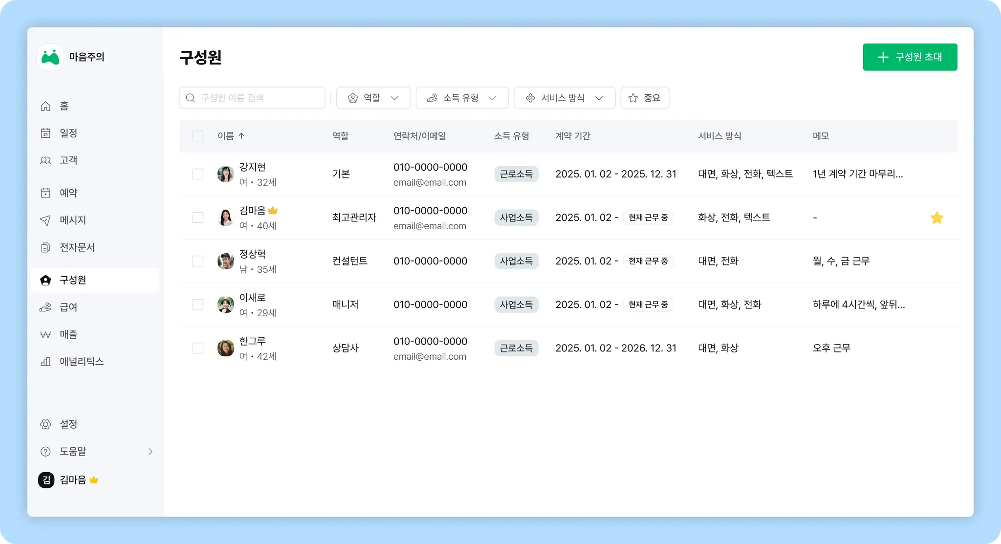 구성원 관리는 기관·센터 운영에서 가장 기본이 되는 관리 기능이에요.
