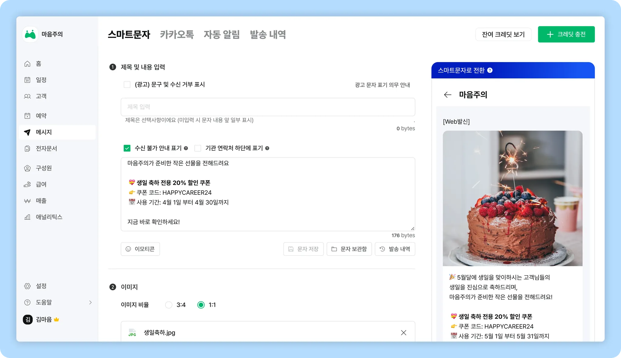 예약 안내부터 마케팅 메시지까지, 마음주의 메시지는 고객과의 모든 커뮤니케이션을 한 곳에서 관리할 수 있어요.