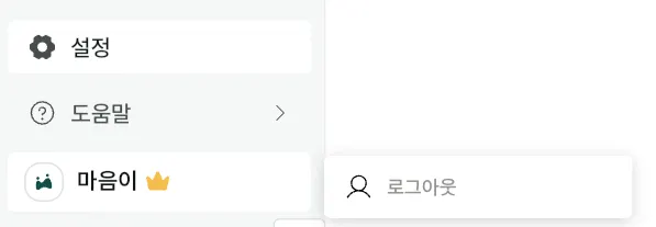 좌측 하단 [도움말] 아래, 유저 계정을 클릭하시면 [로그아웃]이 됩니다