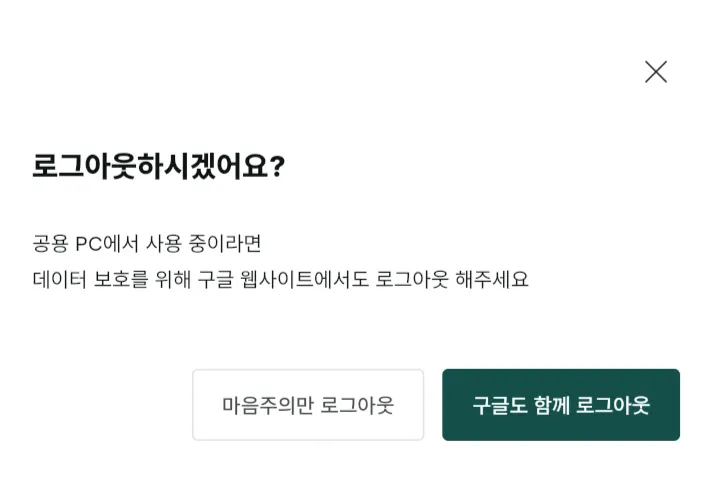 공용 PC를 사용하시는 업무 환경에 맞게, 네이버/카카오/구글 계정으로 마음주의를 이용 중이신 이용자 분들은 완전한 로그아웃 후 다시 이용 시 로그인이 가능하십니다