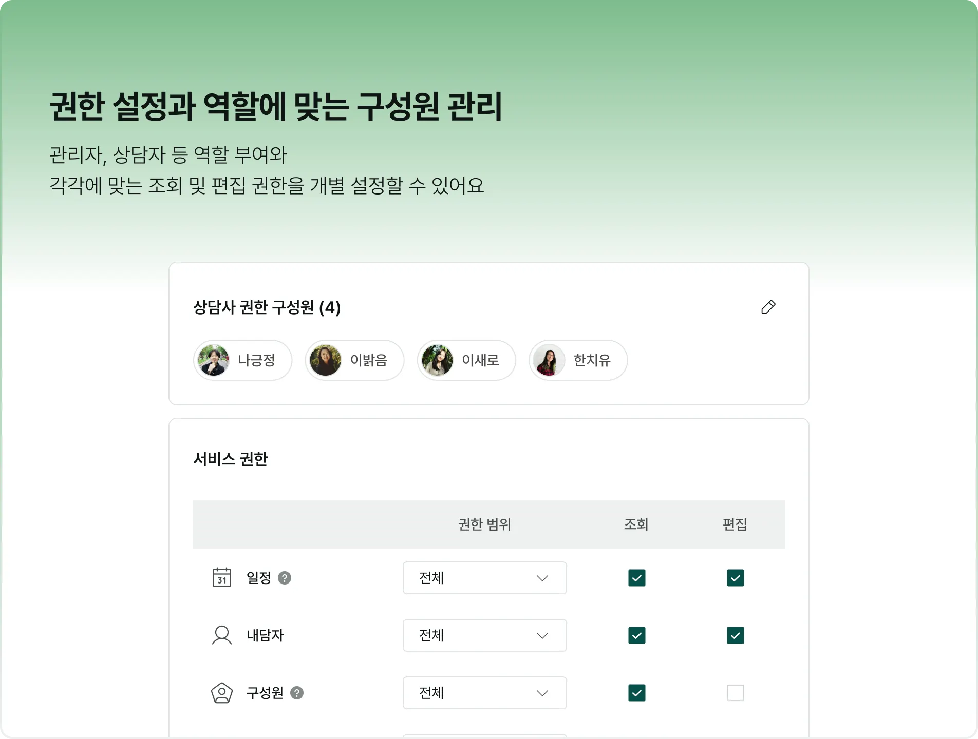 센터 현황에 맞게 구성원 역할을 추가하고 역할에 맞는 권한을 설정할 수 있어요.