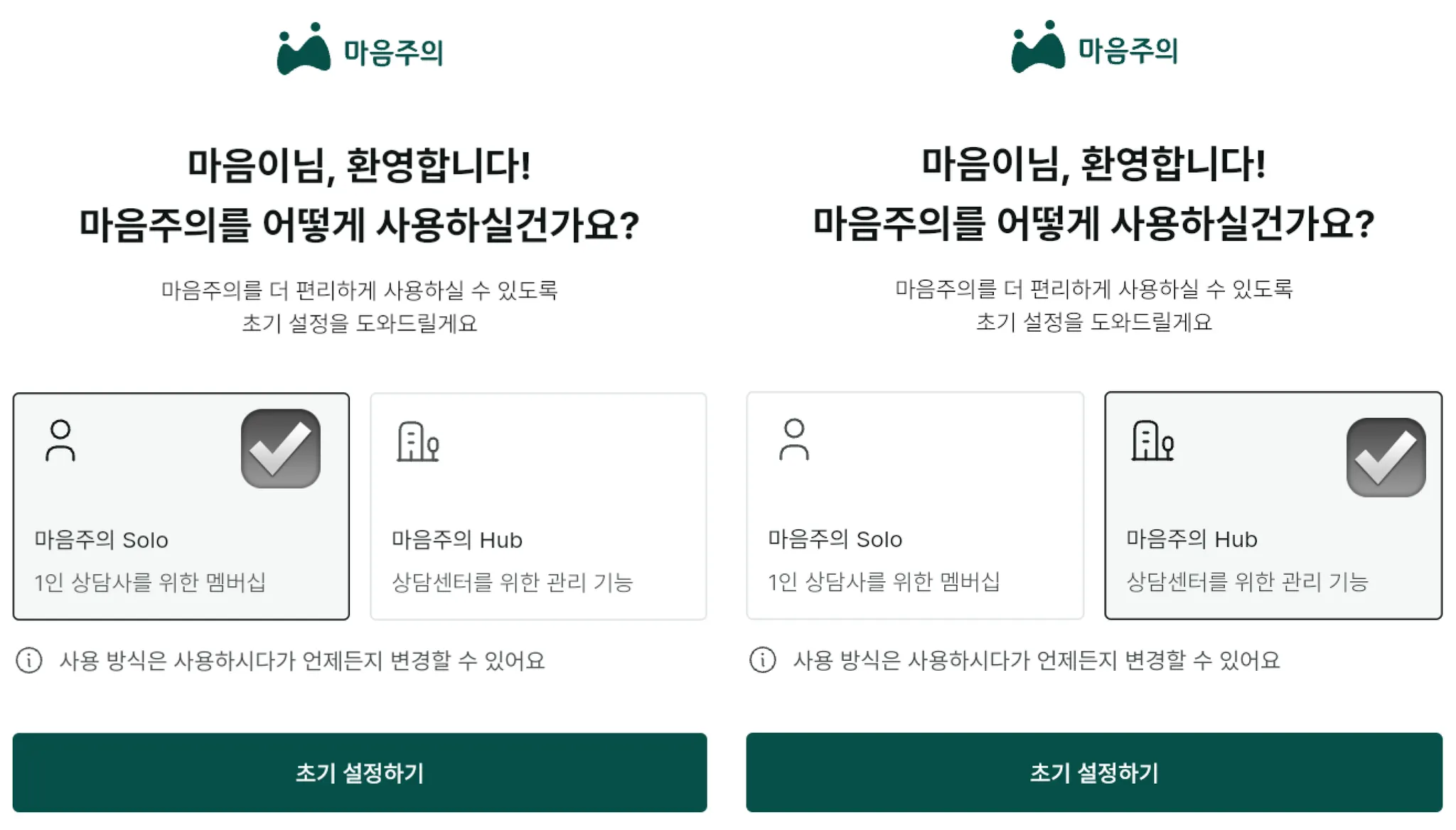 신규 가입자: 회원가입 후 나타나는 초기 설정 화면에서 마음주의 Solo를 선택해 체험할 수 있어요.