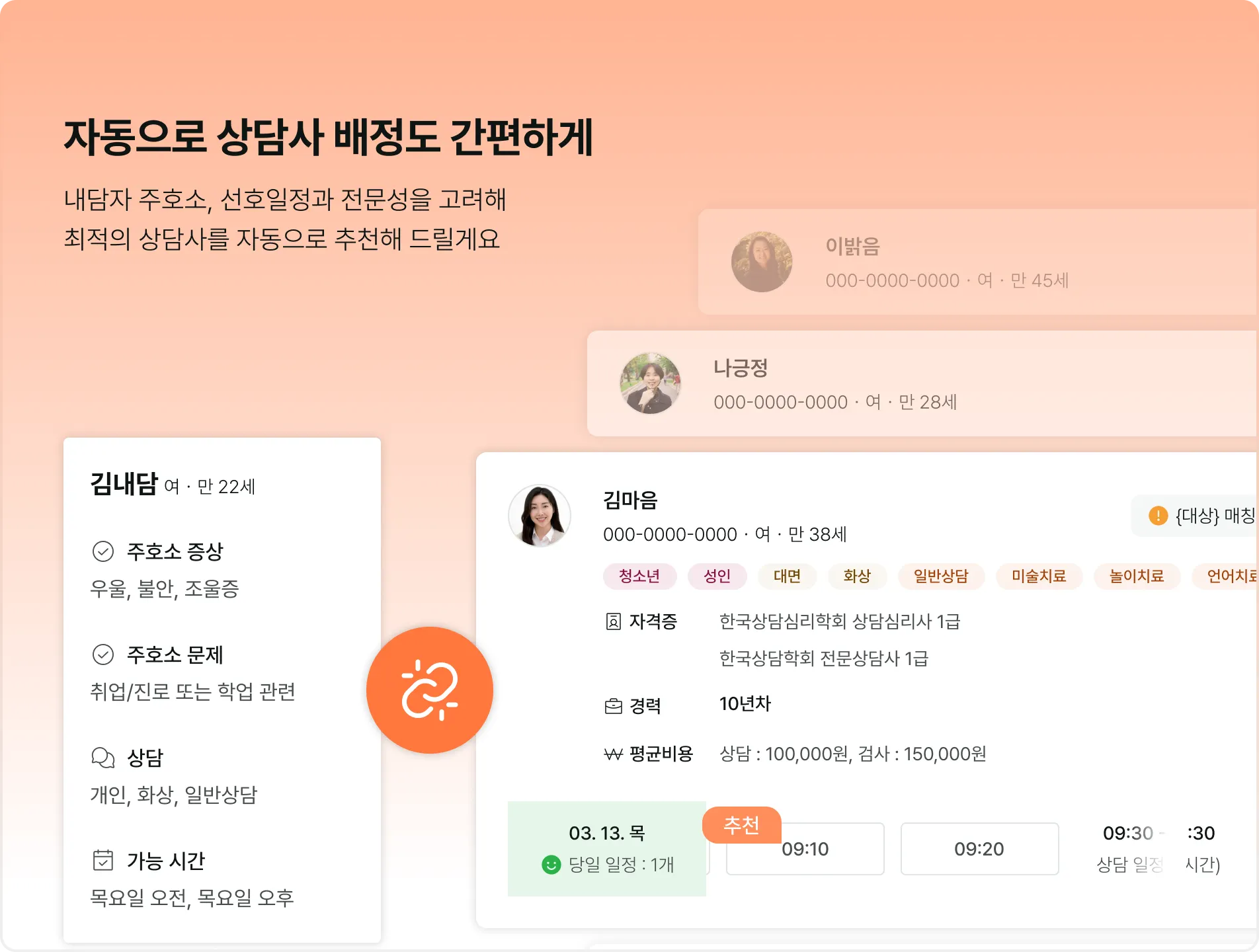 내담자 정보와 상담자의 전문성 등을 분석해 최적의 상담사를 추천해 드려요.