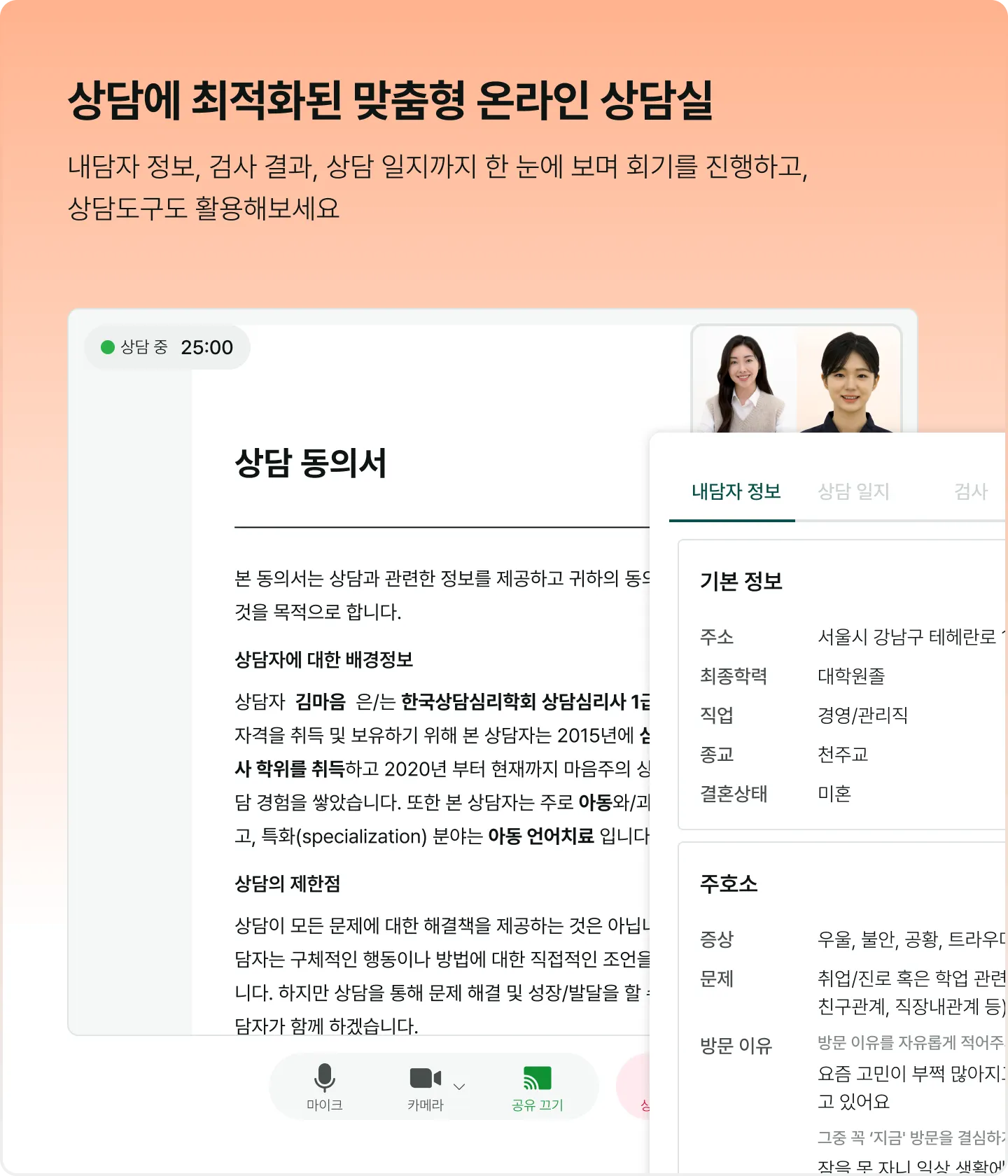 화상 상담을 진행하며 내담자 정보, 검사 결과, 상담 일지까지 살펴보며 회기를 진행해보세요. 상담에 필요한 온라인 상담 도구까지 갖추어져 있답니다.