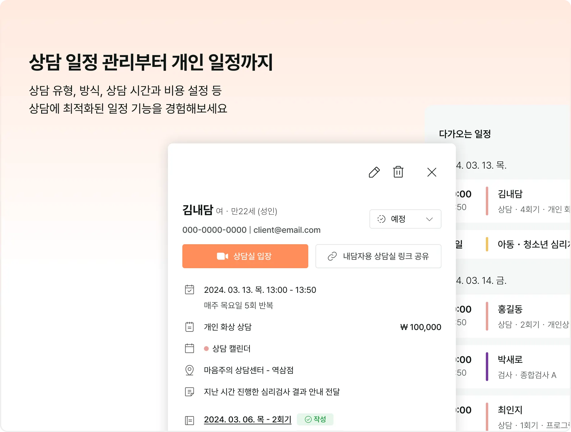마음주의 Solo: 일정, 내담자 및 문서 관리, 자동 알림, 온라인 상담실, 정산, 통계까지!