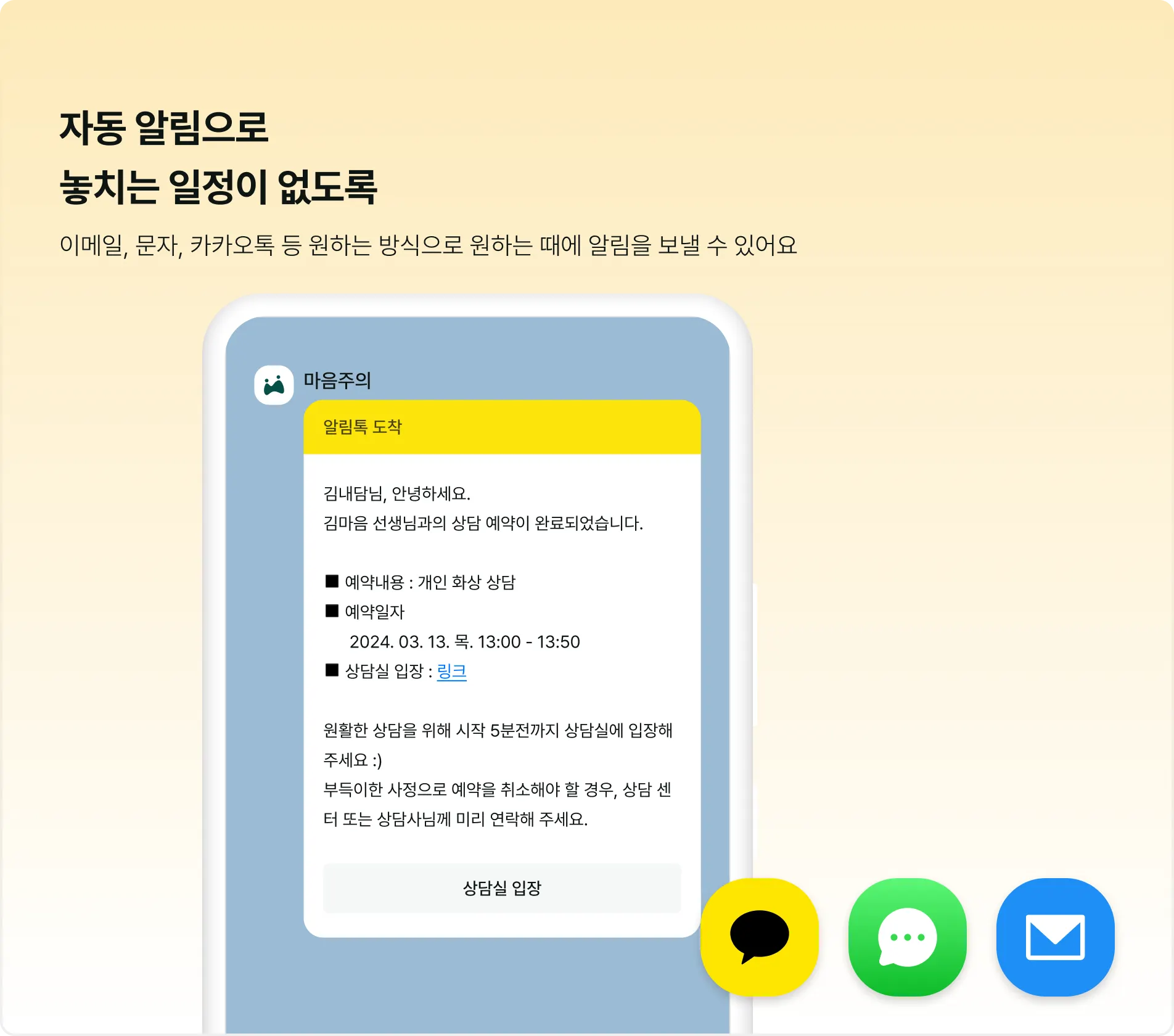 바쁜 일상 속에 상담일정을 놓치지 않도록 상담자와 내담자에게 예약 혹은 일정에 대해 이메일, 문자 혹은 카카오톡으로 알림을 보낼 수 있어요(상담 시작 15분전 등).