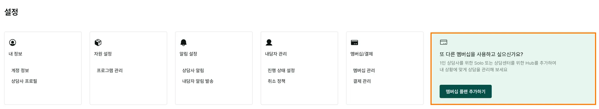 방법 2: [설정] 메뉴를 눌러 나타나는 [멤버십 플랜 추가하기]의 버튼을 눌러 Hub 계정을 체험할 수 있어요.