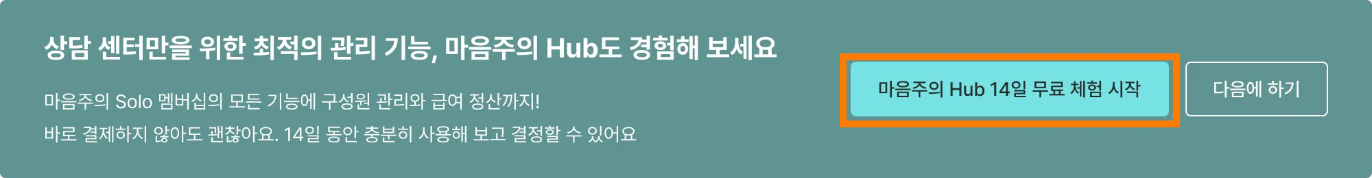 방법 1: 로그인 후 나타나는 상단 배너의 ‘마음주의 Hub 무료 체험 시작’버튼을 눌러 체험할 수 있어요.