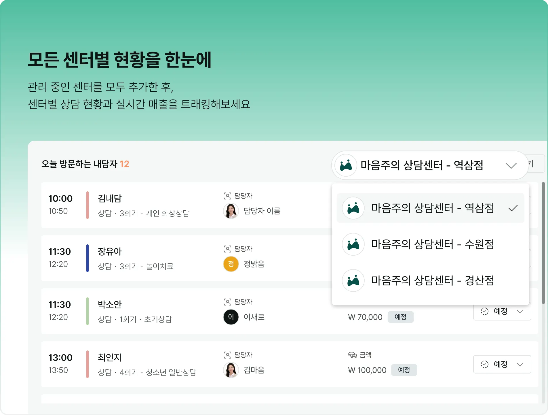센터 관리 - 관리 중인 센터를 추가하고, 센터 별 상담 현황과 실시간 매출 등을 살펴볼 수 있어요.
