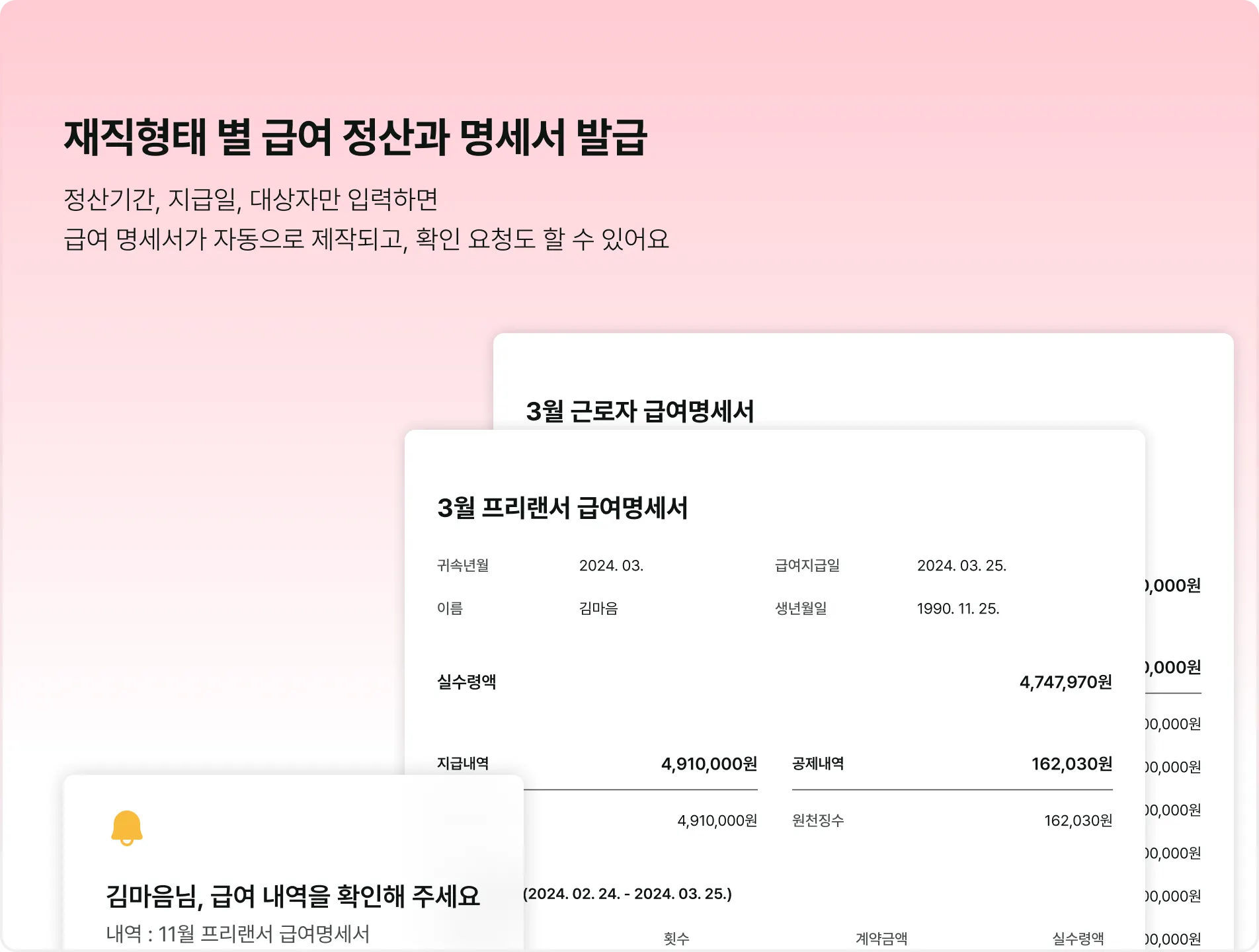 급여 명세서를 자동으로 제작할 수 있으며, 급여 대상자에게 확인 요청을 할 수 있어요.