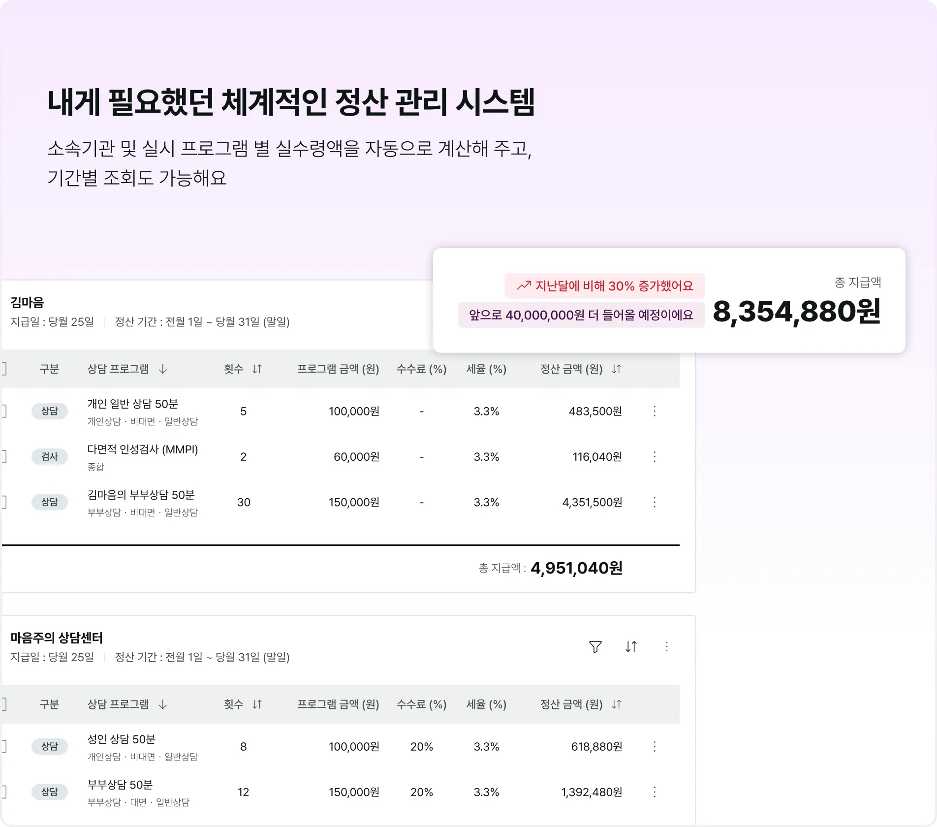 마음주의 Hub: 센터 및 구성원 관리, 계정 권한 설정, 급여 정산, 통계, 상담사 자동 추천까지!