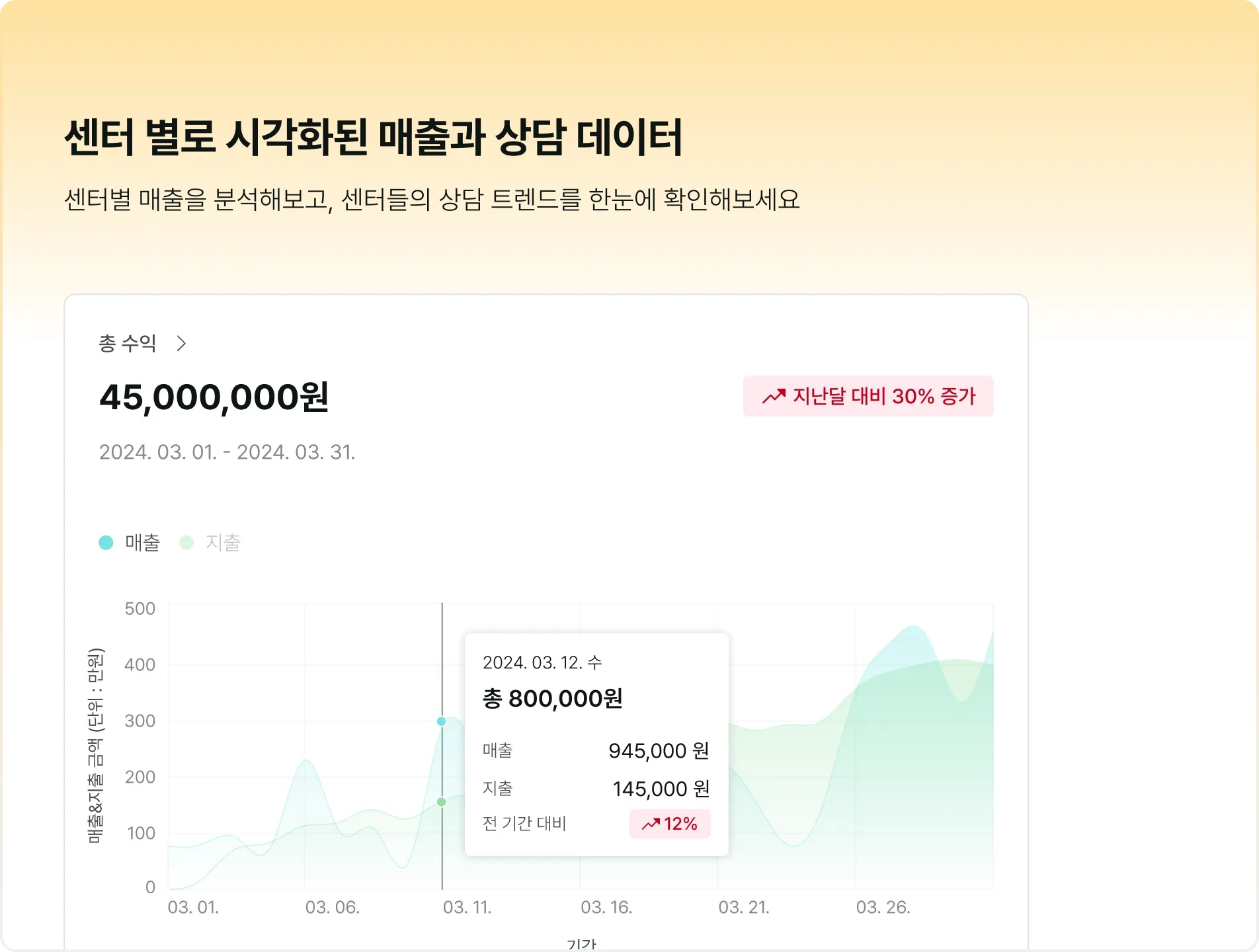 센터의 매출을 분석하고, 상담 혹은 내담자 등을 분석해 운영에 도움을 받을 수 있어요.